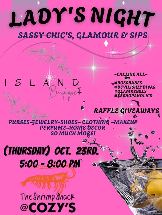 Join us at Cozy’s on October 23rd for an unforgettable Ladies Night at cozy’s with Island Boutique! Enjoy your favorite drinks, purses, jewelry, makeup, perfume, and more from 5-8pm! Enter the raffle for a chance to win an amazing basket from Island Boutique with all your favorite little goodies!