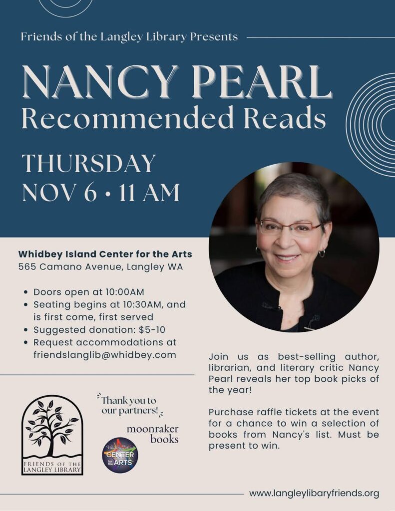 Join the Friends of the Langley Library as we welcome the wonderful Nancy Pearl back to Whidbey Island! A best-selling author, librarian, and literary critic, Nancy has dedicated her life to celebrating the joy of reading and sharing the belief that books can change lives.