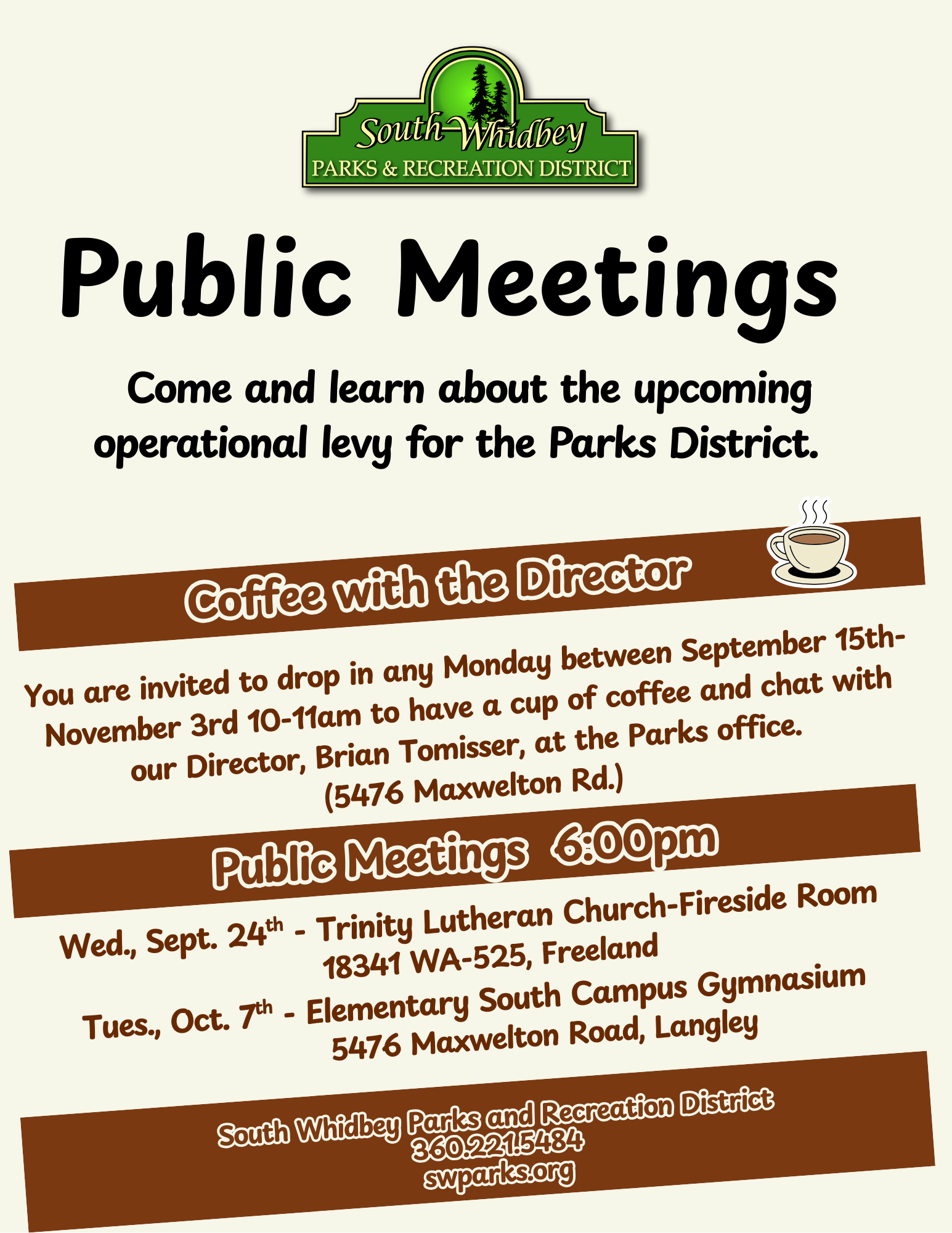 ![]() Parks & Recreation Public Meetings Coffee with the Director: Stop by the Director’s office any Monday, Sept. 15 – Nov. 3, to discuss the upcoming operational levy project. Public Meetings:…