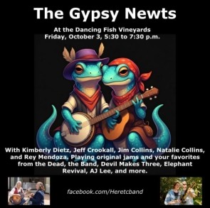 ![]() Friday Night Music at Dancing Fish - The Gypsy Newts Friday, October 3rd ~ 5:30 – 7:30 p.m. The Gypsy Newts will be performing at Dancing Fish Vineyards for the first…