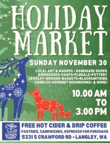 ![]() Holiday Market at Coffee at Dawn Sunday, November 30th  ~  10 a.m. – 3 p.m. Coffee at Dawn 5331 S Crawford Road Langley A variety of handmade, quality art and… |
